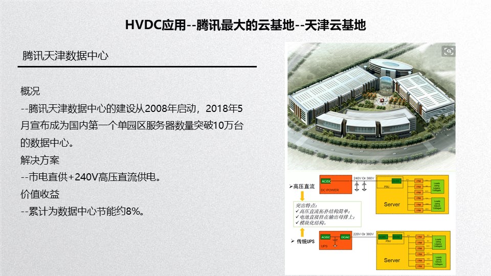 騰訊天津數(shù)據(jù)中心,經(jīng)過十余年建設(shè),于2018年5月成功建成中國第一個單個園區(qū),突破10臺服務(wù)器,全部采用HVDC+市電直供技術(shù)。目前已經(jīng)累計運行十年以上,節(jié)能8%以上。