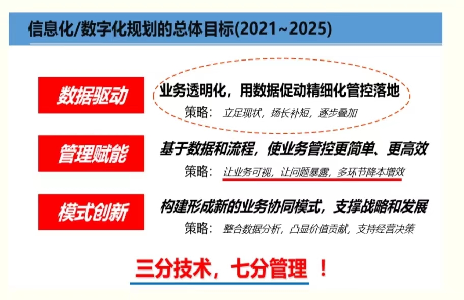 總結(jié)過去兩年多的信息化戰(zhàn)略執(zhí)行情況后,首席信息官葉根平還明確提出未來兩年中恒信息化/數(shù)字化轉(zhuǎn)型的建設(shè)應(yīng)繼續(xù)按照《中恒電氣信息化/數(shù)字化戰(zhàn)略規(guī)劃(2021~2025)》所設(shè)定的目標(biāo)和項(xiàng)目實(shí)施執(zhí)行,同時(shí)也發(fā)布了《中恒電氣管理升級(jí)與數(shù)字化轉(zhuǎn)型戰(zhàn)略執(zhí)行方案(2024~2025)》。