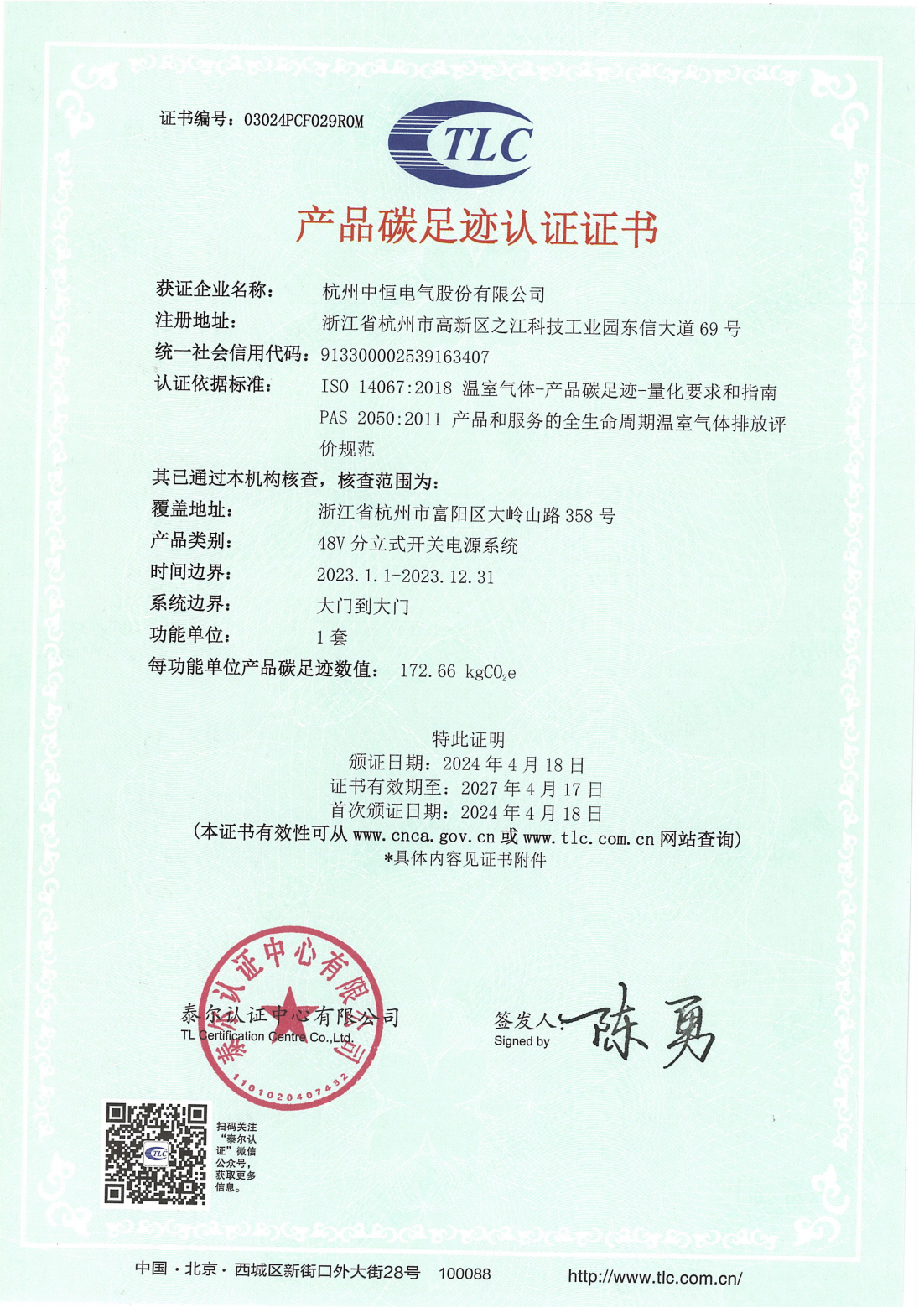 【公示】產品碳足跡認證證書-48V分立式開關電源系統