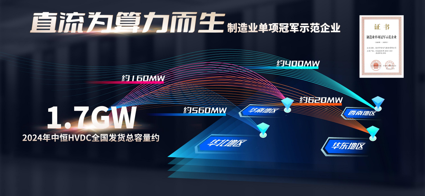 隨著人工智能技術(shù)的飛速發(fā)展,數(shù)據(jù)中心也面臨著前所未有的變革。HVDC技術(shù)以其高效、穩(wěn)定的特性,能夠有效滿(mǎn)足數(shù)據(jù)中心對(duì)電力供應(yīng)的高要求,為數(shù)據(jù)中心的穩(wěn)定運(yùn)行提供堅(jiān)實(shí)保障。在過(guò)去的一年中,中恒電氣作為 HVDC供電方案的先行者,其技術(shù)與產(chǎn)品已迅速擴(kuò)展至全國(guó)主要的算力核心區(qū)域。2024年累計(jì)裝機(jī)容量達(dá)到1.7GW,這不僅體現(xiàn)了數(shù)字上的規(guī)模,更象征著算力領(lǐng)域?qū)χ绷骷夹g(shù)的廣泛信任與深度認(rèn)可。