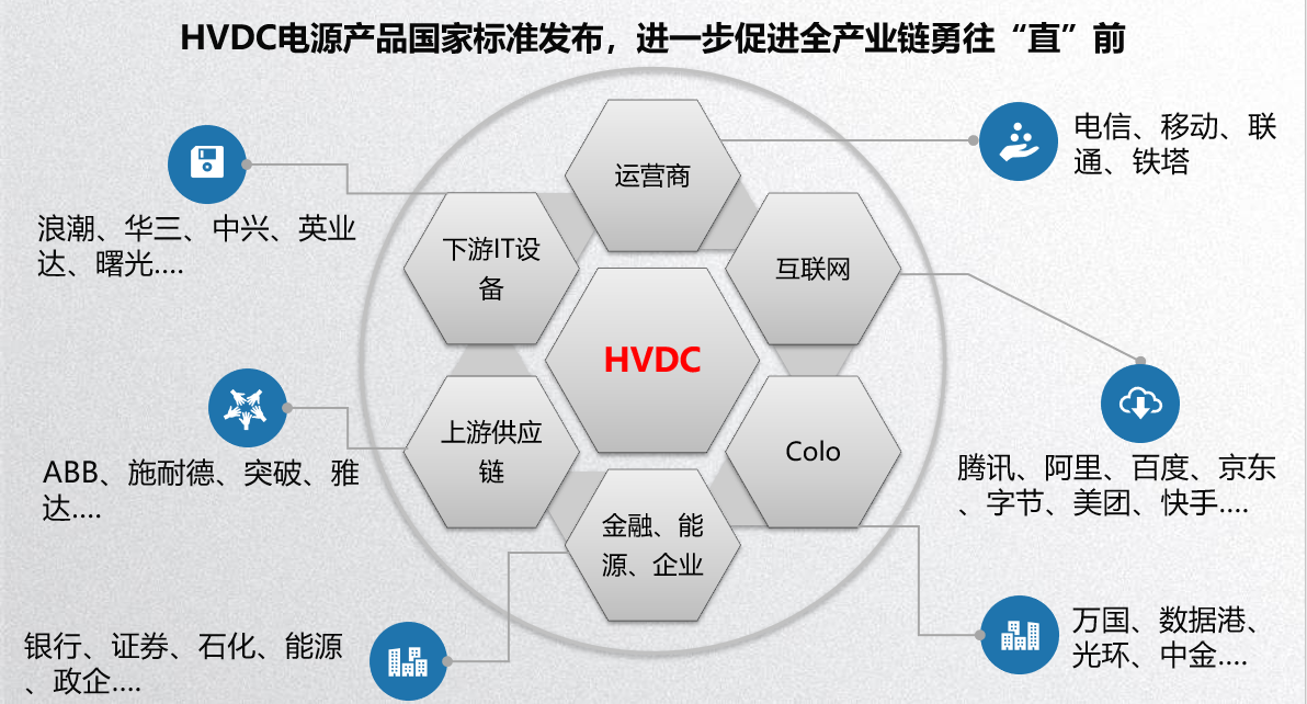 HVDC國標的發布,為終端用戶(運營商、互聯網、金融、政企等)、第三方Colo,到產業鏈的IT設備,再到產業鏈的相關硬件提供更加完善的理論體系支撐,促進IDC全產業鏈勇往“直”前。